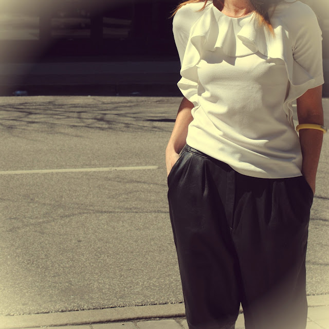 Often times my inspiration when vintage and thrift shopping comes from looks that I see on the runway, in magazines and on the street. I love the challenge of finding garments that may not be perfect but have 'good bones' and making them work to satisfy my style cravings. I am in love with boyfriend trousers and while you can find this style in denim at almost every store right now, I thought that this look in leather would take it to the next level. Finding the leather London Fog trousers pictured above was kind of a happy accident. I was actually shopping for a leather skirt that I had plans to deconstruct and make into a purse. While I found a skirt last seen here, it ended up fitting so well that I actually added it to my wardrobe rather than tear it apart. I grabbed these pants as a back up because of the amount of usable leather but when I tried them on, I was inspired to make my dream of leather boyfriend trousers come true. After a visit to my trusty seamstress and a lapse of just 24 hours, I had my very own custom leather boyfriend trousers. I guess my purse idea will have to wait!